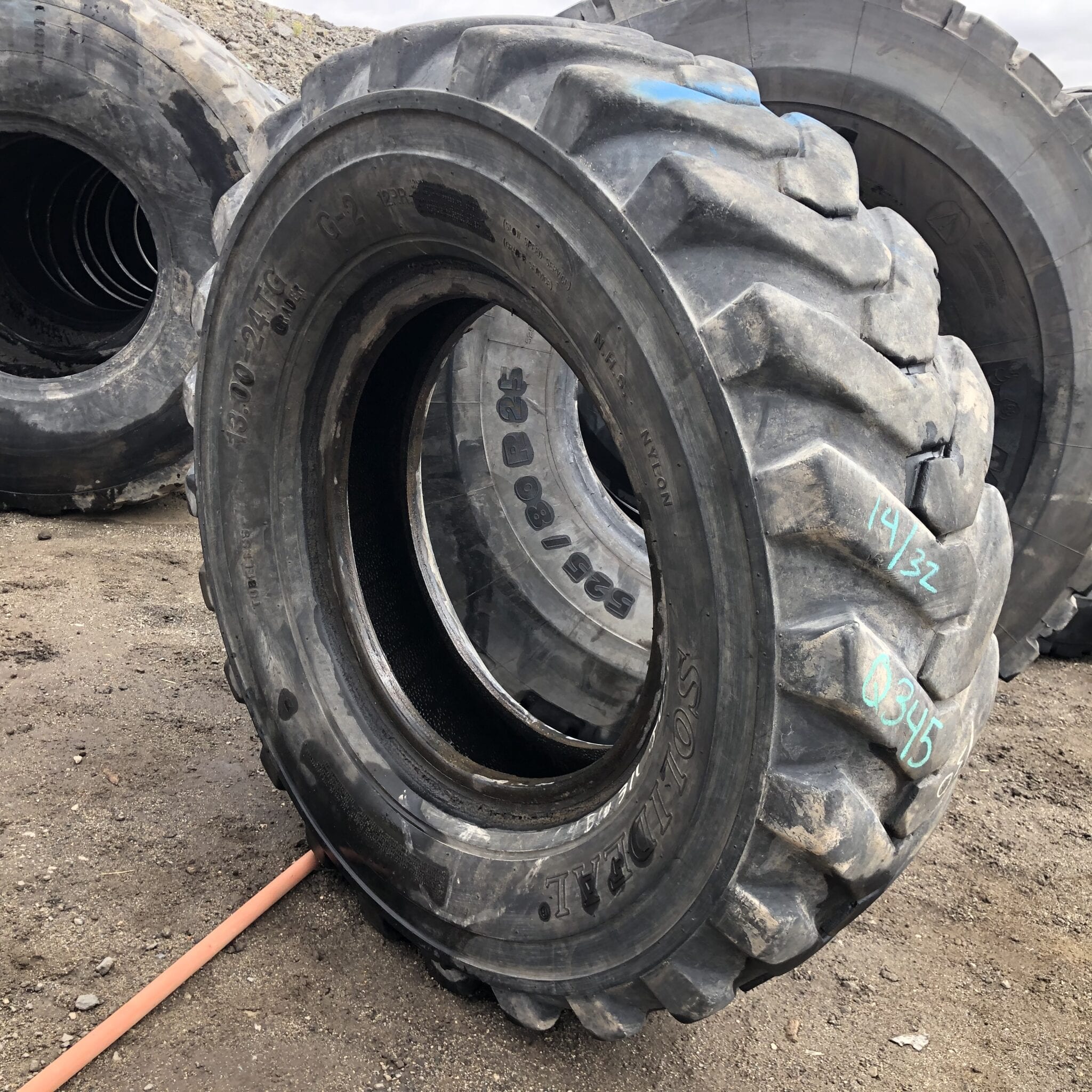13.00X24 Solideal brand bias OTR tractor tire. It is a G2 G2 model with a 12-Ply load rating. This is a Used tire with a tread depth of 14/32nds. The condition report reads: Clean, 1-Tread Plug, Bead Flange Wear.