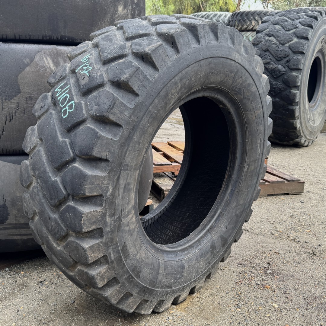 15.5R25 Mitas brand radial OTR tractor tire. It is a EM-60 E3/L3 model with a 12-Ply load rating. This is a Used tire with a tread depth of 16/32nds. The condition report reads: Clean.