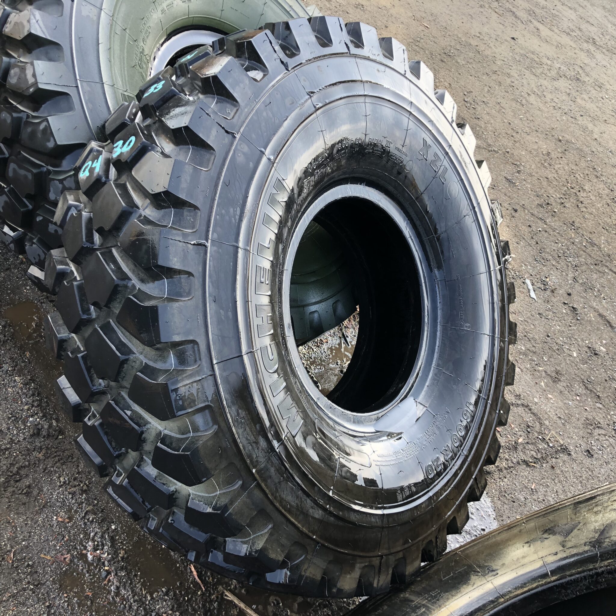 16.00R20 Michelin brand radial OTR tractor tire. It is a XML Military M3 OffRoad model with a 173/170G load rating. This is a New-Take-Off tire with a tread depth of 34/32nds. The condition report reads: Clean.