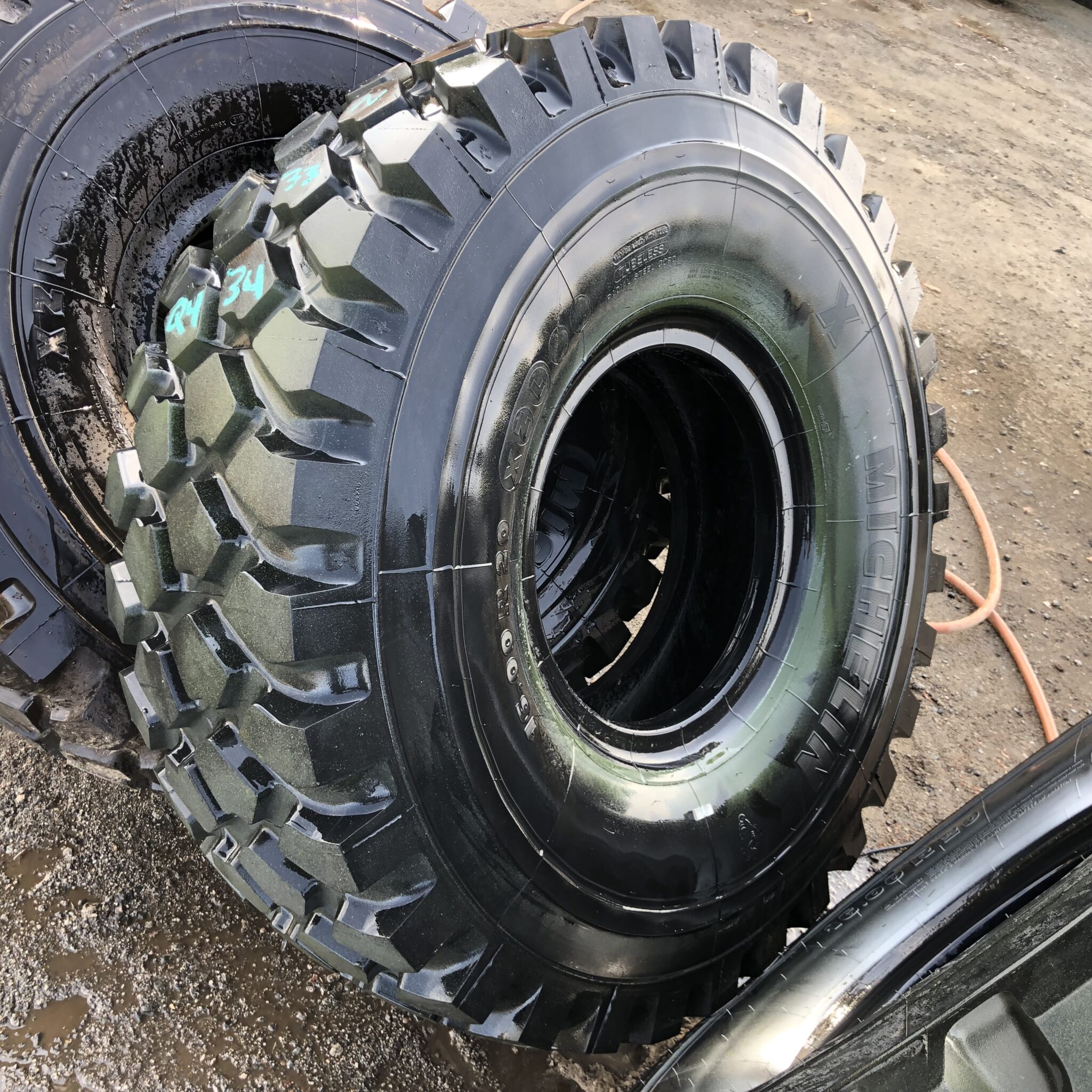 16.00R20 Michelin brand radial OTR tractor tire. It is a XML Military M3 OffRoad model with a 173/170G load rating. This is a New-Take-Off tire with a tread depth of 34/32nds. The condition report reads: Clean.