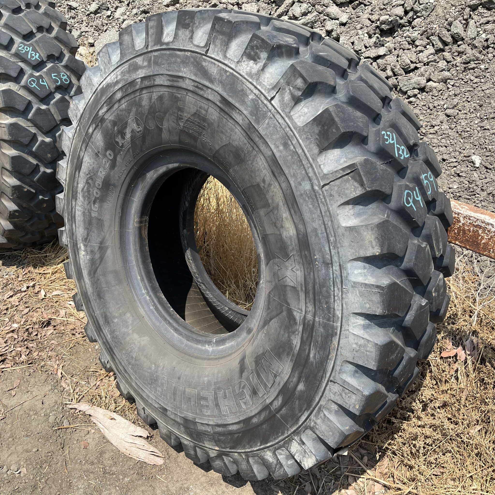16.00R20 Michelin brand radial OTR tractor tire. It is a XML Military M3 OffRoad model with a 173/170G load rating. This is a Used tire with a tread depth of 32/32nds. The condition report reads: Clean, 2011.