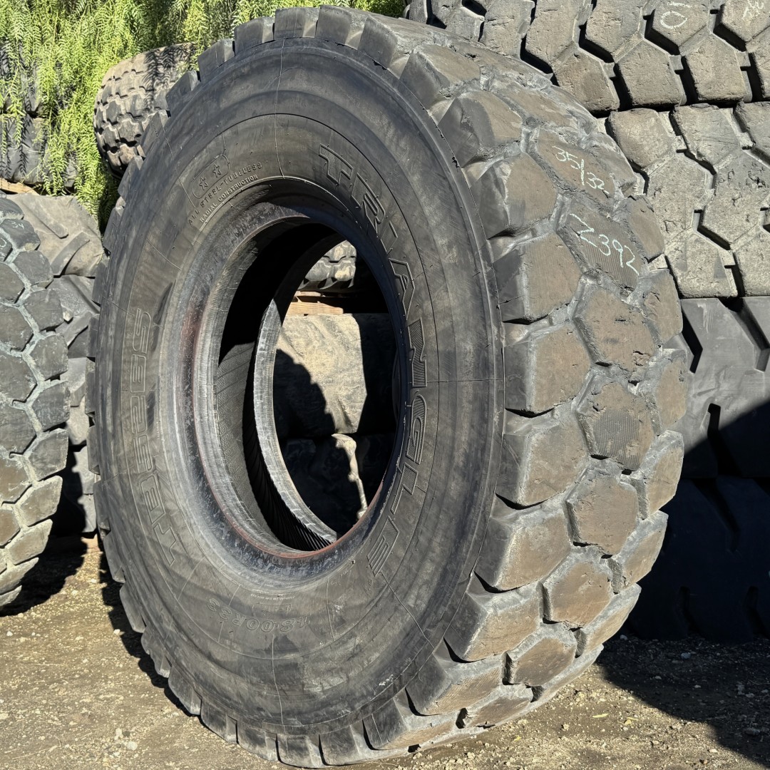 18.00R33 Triangle brand radial OTR tractor tire. It is a TB526S E4 model with a 2-Star load rating. This is a Used tire with a tread depth of 35/32nds. The condition report reads: Clean, Sidewall Cut on One Side.