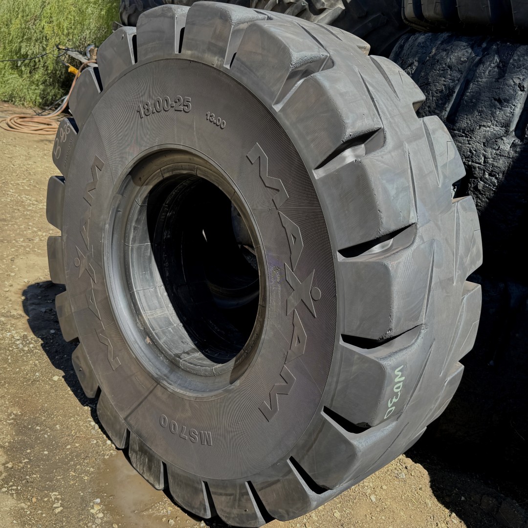 18.00X25 Magna brand bias OTR tractor tire. It is a MS700 Industrial Pro Forklift model with a Solid load rating. This is a Used tire with a tread depth of 86/32nds. The condition report reads: Clean, Minor Tread Cuts.