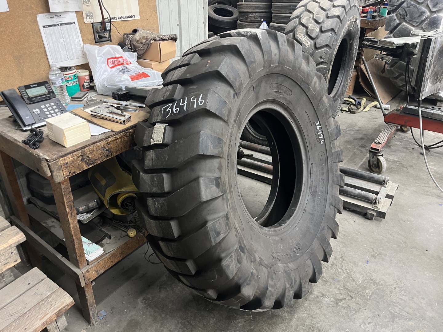 20.5X25 Goodyear brand bias OTR tractor tire. It is a GGL D E-2/L-2/G-2 model with a 16-Ply load rating. This is a New tire with a tread depth of 36/32nds. The condition report reads: Unused.