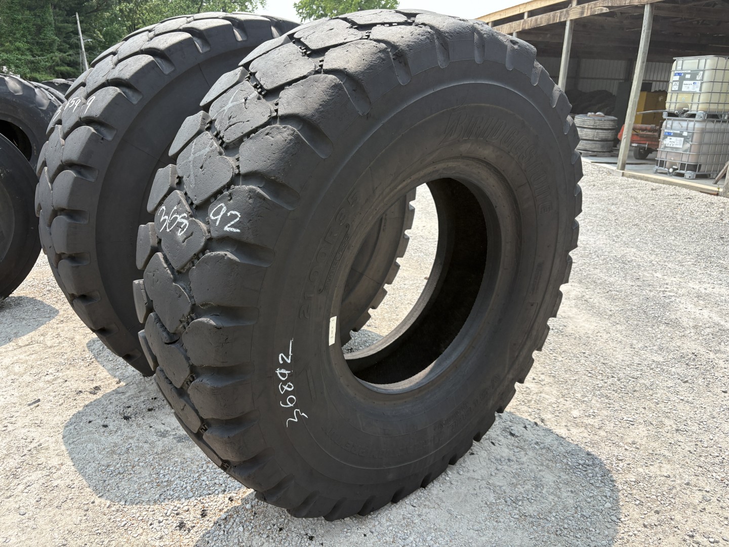 21.00R35 Bridgestone brand radial OTR tractor tire. It is a VMTP E-4 model with a 2-Star load rating. This is a Used tire with a tread depth of 28/32nds. The condition report reads: Clean, Choppy/Uneven Tread.