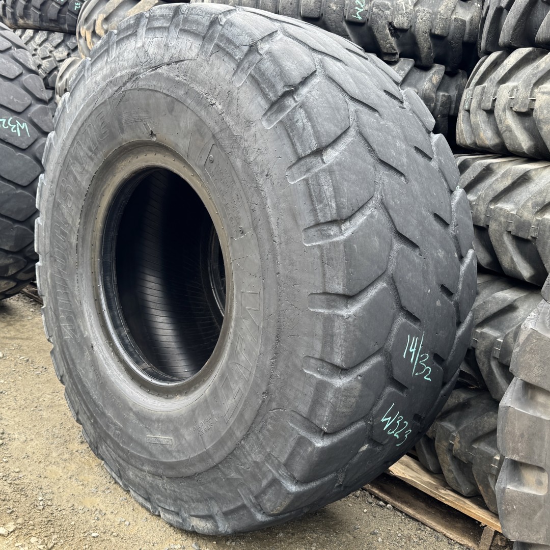 23.5R25 Bridgestone brand radial OTR tractor tire. It is a VJT L3/G3 model with a 1-Star load rating. This is a Used tire with a tread depth of 14/32nds. The condition report reads: Clean, Cosmetic Rock Cuts on One Sidewall.