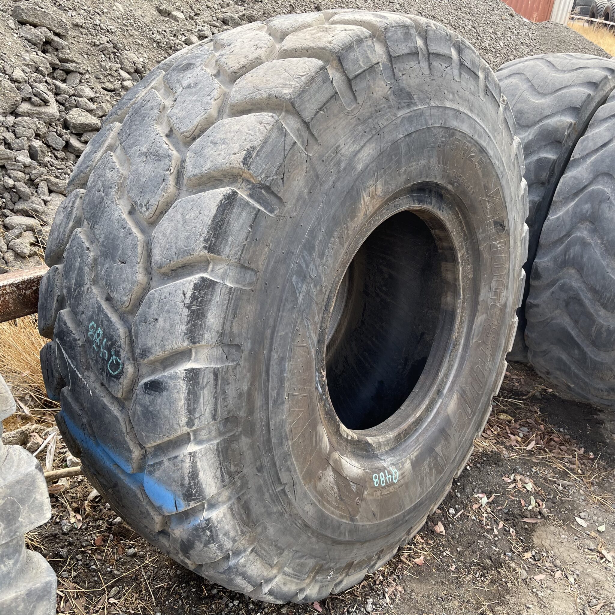 23.5R25 Bridgestone brand radial OTR tractor tire. It is a VJT L3/G3 model with a 1-Star load rating. This is a Used tire with a tread depth of 28/32nds. The condition report reads: Clean, Severe Sidewall Circular Damage. Sidewall Spots Recommended.
