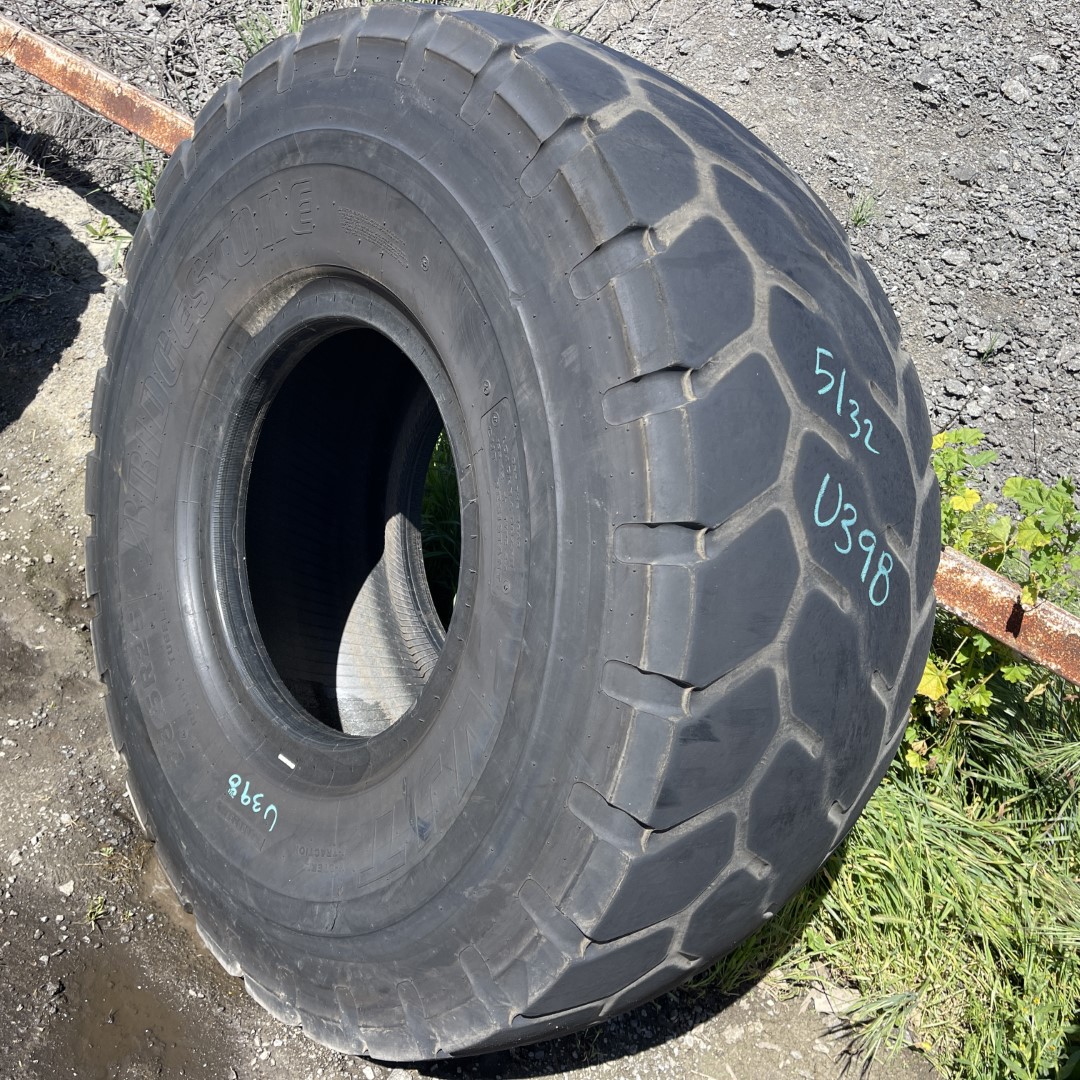 23.5R25 Bridgestone brand radial OTR tractor tire. It is a VJT L3/G3 model with a 1-Star load rating. This is a Used tire with a tread depth of 5/32nds. The condition report reads: Clean, Low Rubber.