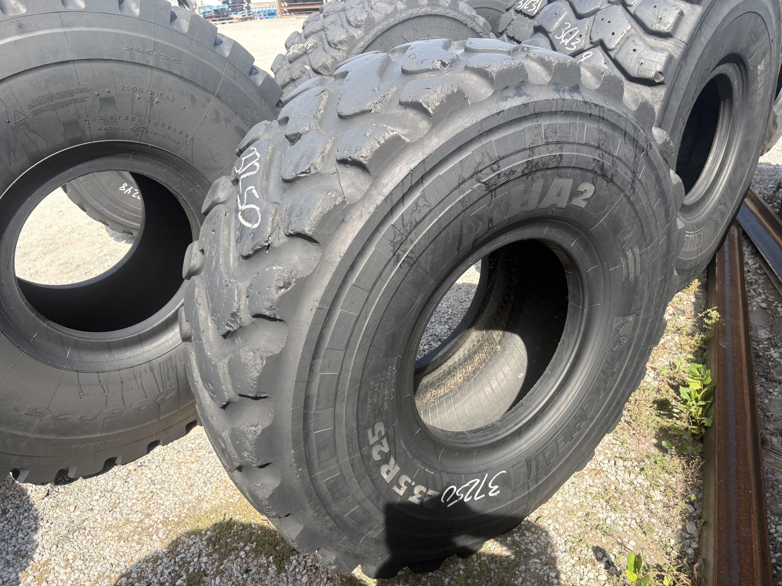 23.5R25 Michelin brand radial OTR tractor tire. It is a XHA2 E-3/L-3 model with a 1-Star load rating. This is a Used tire with a tread depth of 36/32nds. The condition report reads: Has 2 NH Patches Tread, Spot Tread, Has Some Cuts Lugs.