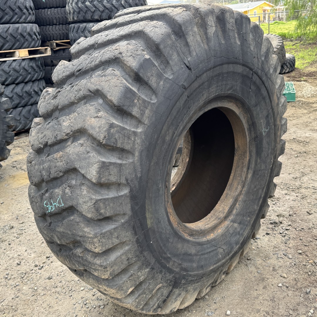 23.5X25 BF Goodrich brand bias OTR tractor tire. It is a Rock Service E3/L3/G3 model with a 20-Ply load rating. This is a Retread-Used tire with a tread depth of 33/32nds. The condition report reads: Aged Sidewalls, Rough Bead, Install with L-Ring.