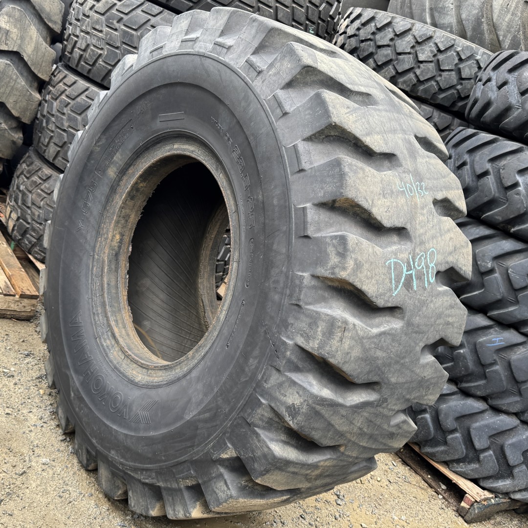 23.5X25 Yokohama brand bias OTR tractor tire. It is a Y575 L3 model with a 20-Ply load rating. This is a Used tire with a tread depth of 40/32nds. The condition report reads: Clean.