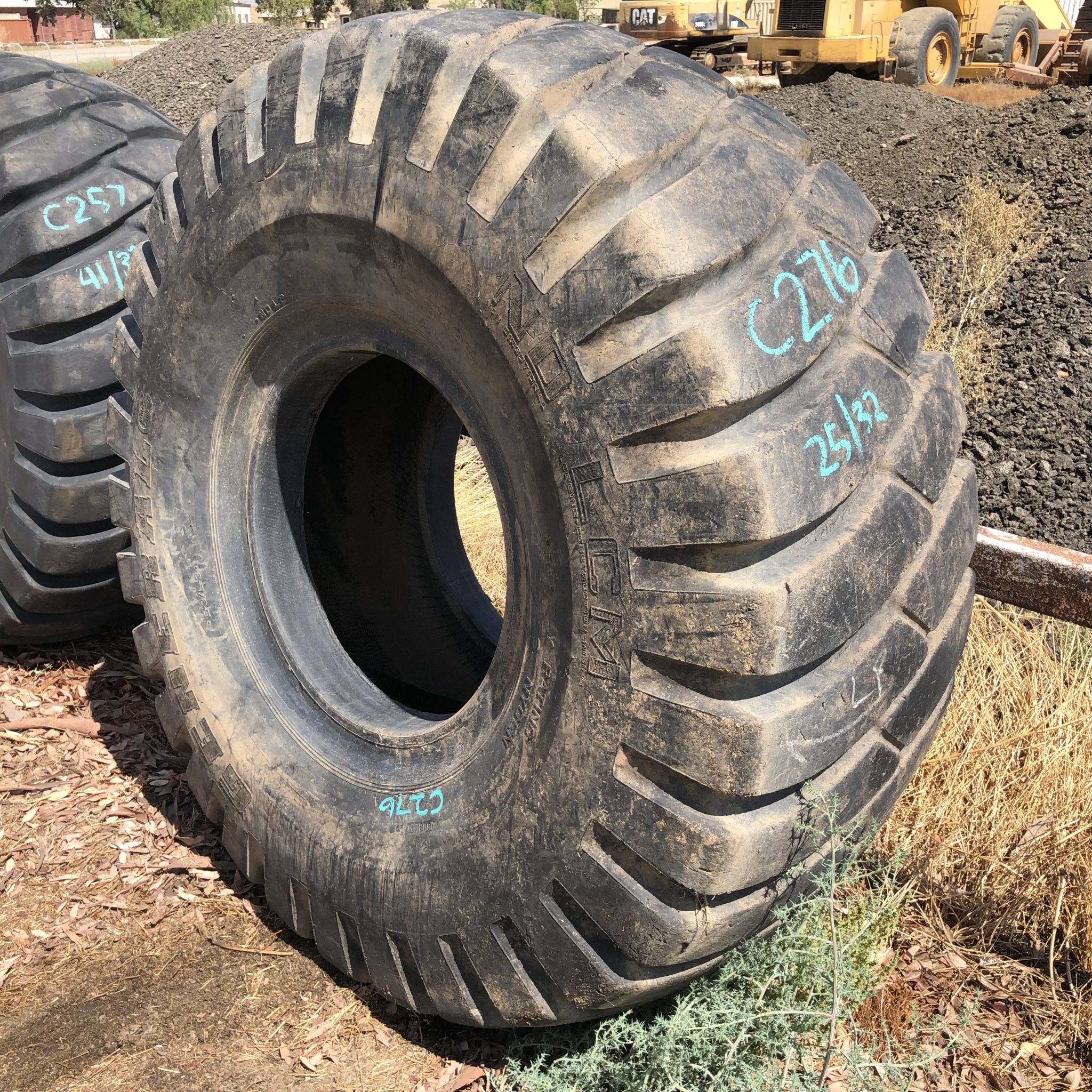 26.5X25 General brand bias OTR tractor tire. It is a NDLCM E3/L3 model with a 26-Ply load rating. This is a Used tire with a tread depth of 25/32nds. The condition report reads: 7-Tread Patches, Nails in tread.