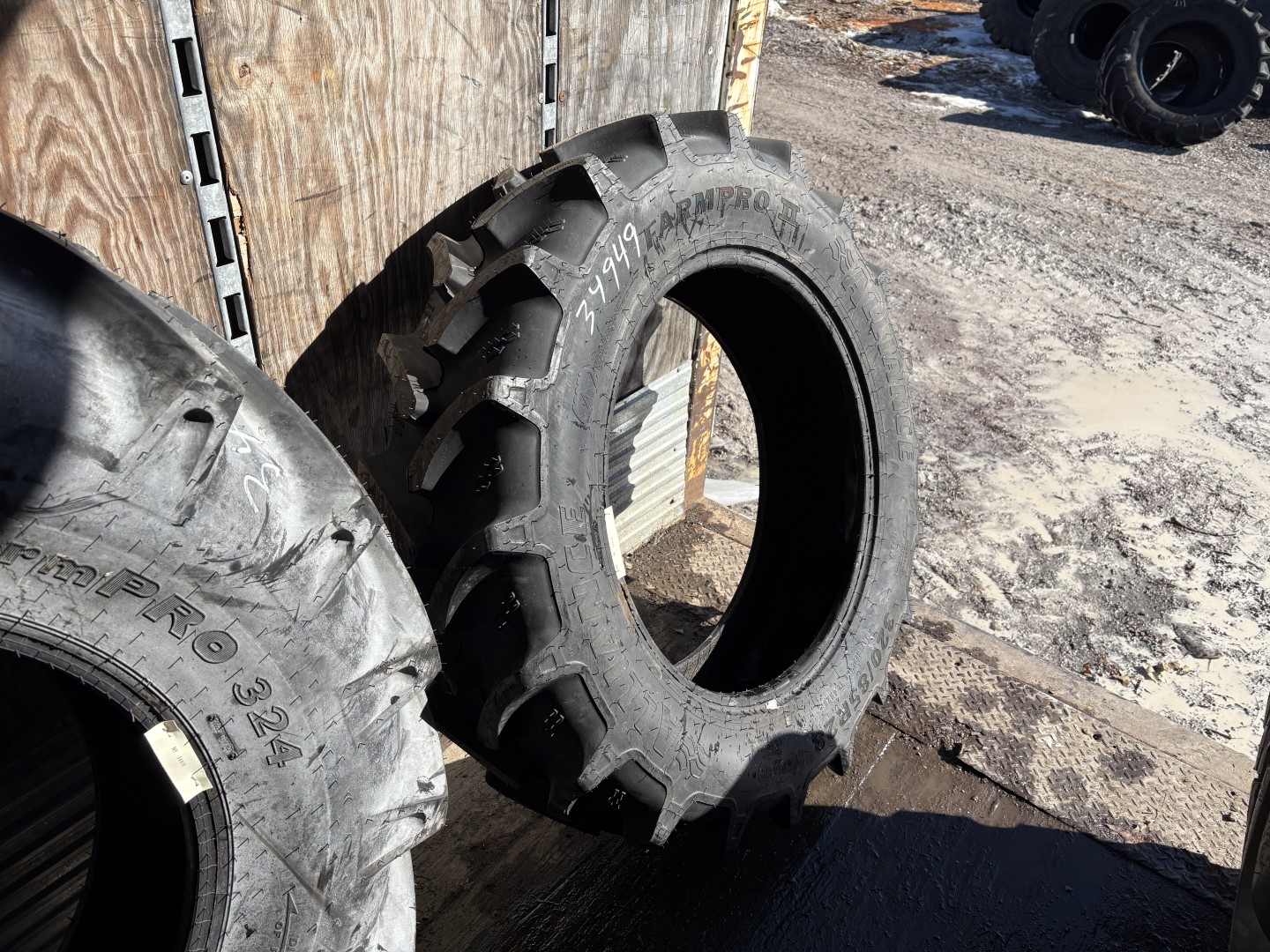 320/85R28 Alliance brand radial OTR tractor tire. It is a FarmPro II R1 model with a 124A8 load rating. This is a New tire with a tread depth of 48/32nds. The condition report reads: Unused, 12.4R28.