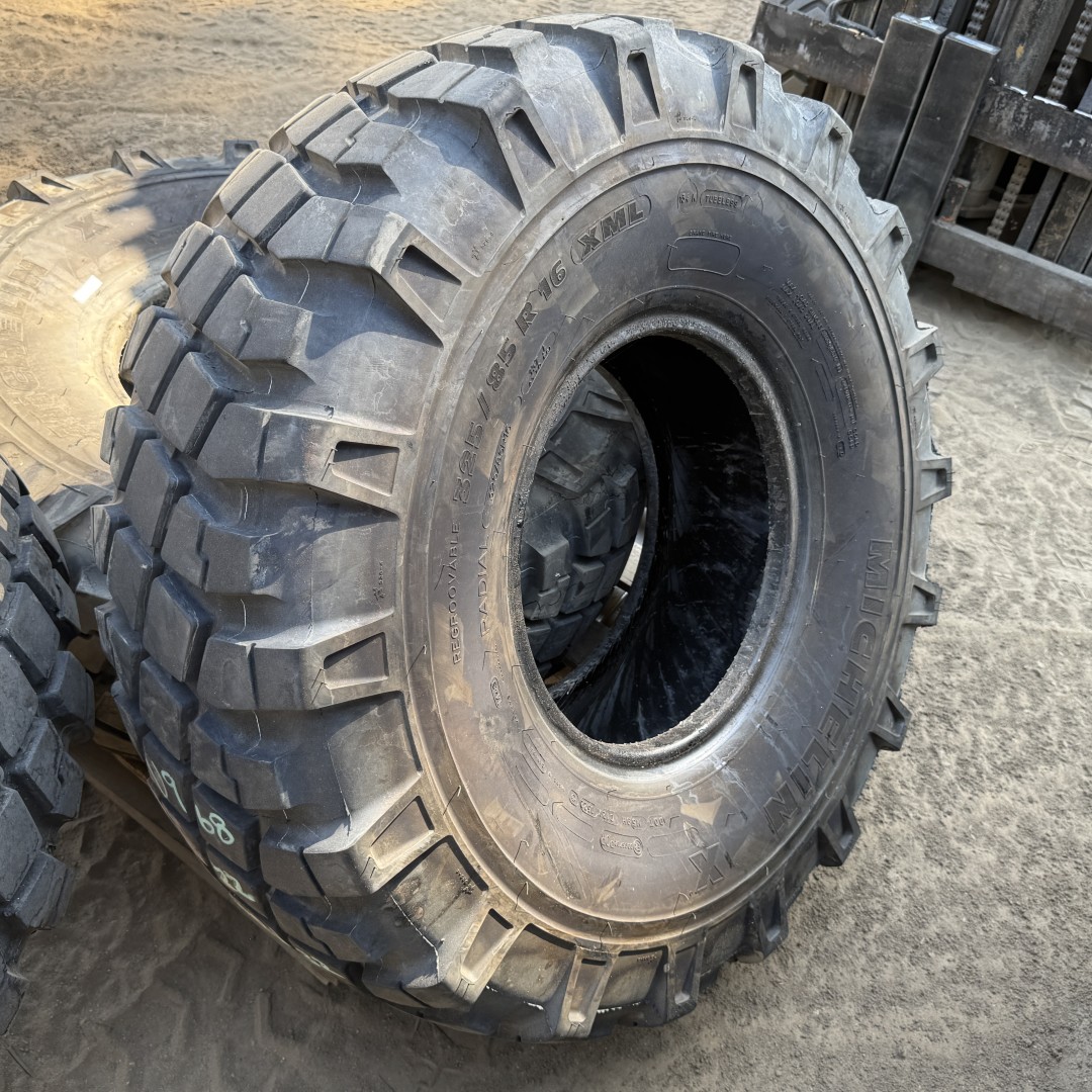 325/85R16 Michelin brand radial OTR tractor tire. It is a XML Military M3 OffRoad model with a 137J load rating. This is a Used tire with a tread depth of 20/32nds. The condition report reads: Clean, 2022.