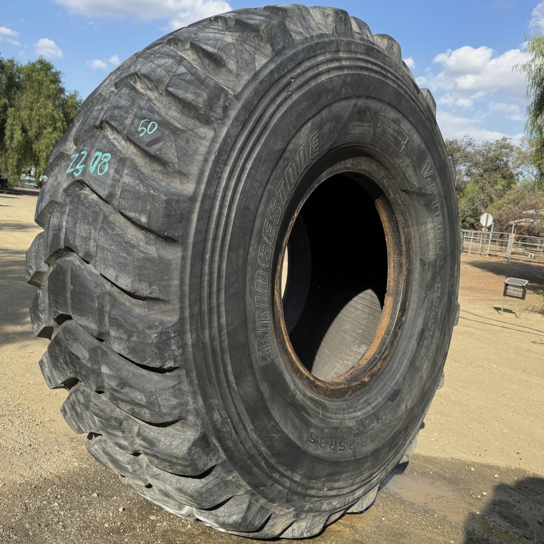 33.25R35 Bridgestone brand radial OTR tractor tire. It is a VKT E2 model with a 2-Star load rating. This is a Used tire with a tread depth of 50/32nds. The condition report reads: Clean.