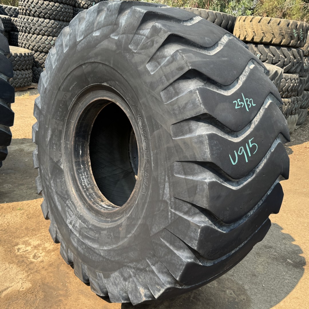 33.25X29 Yokohama brand bias OTR tractor tire. It is a Y67 E-3/L-3/G-3/IND-3 model with a 38-Ply load rating. This is a Used tire with a tread depth of 25/32nds. The condition report reads: Clean.