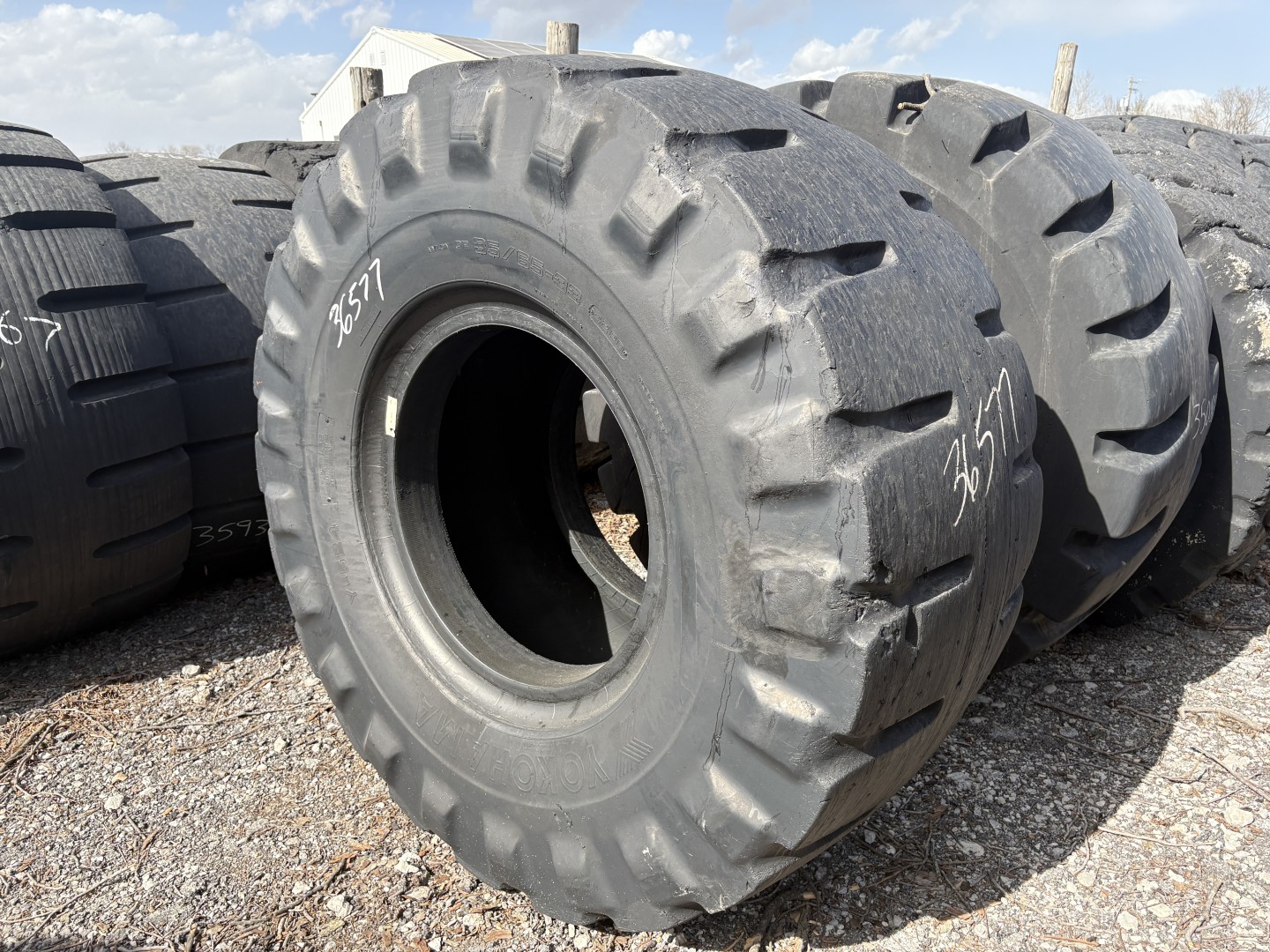 35/65X33 Yokohama brand bias OTR tractor tire. It is a Y524 L5 model with a 42-Ply load rating. This is a Used tire with a tread depth of 48/32nds. The condition report reads: Clean, Sidewall Spot.