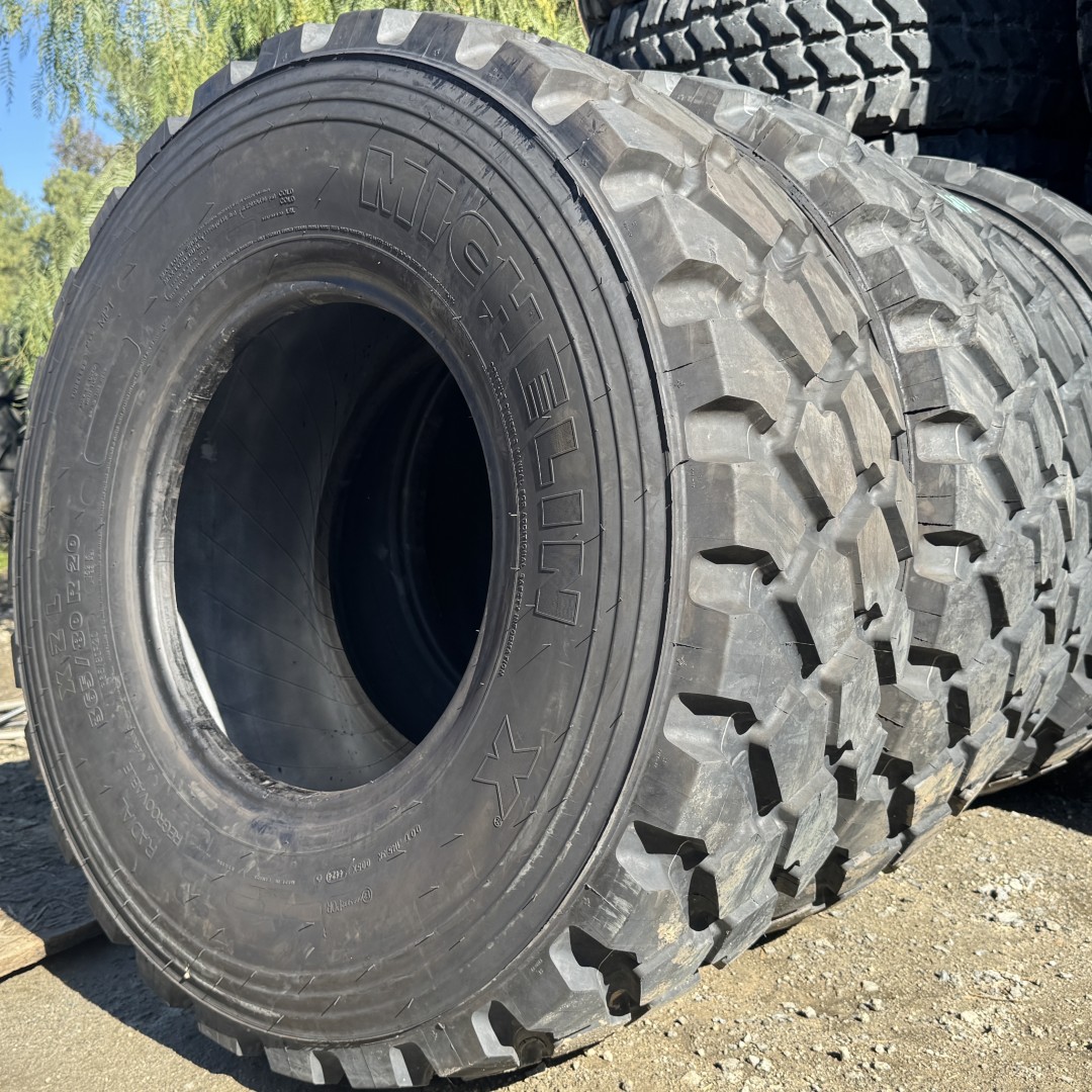 365/80R20 Michelin brand radial OTR tractor tire. It is a XZL Military M3 OffRoad model with a 152K load rating. This is a New-Take-Off tire with a tread depth of 24/32nds. The condition report reads: Clean, 2023.