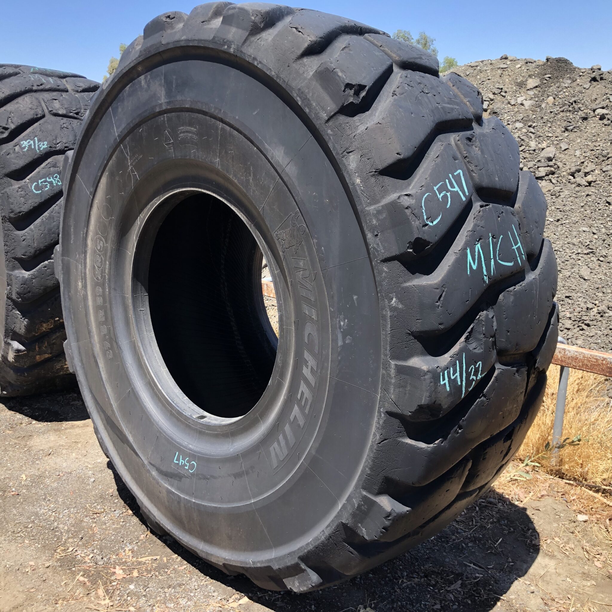 37.5R39 Michelin brand radial OTR tractor tire. It is a XRS E4R model with a 2-Star load rating. This is a Used tire with a tread depth of 44/32nds. The condition report reads: Clean, Some Lug Damage, Mildly Weathered Tread.
