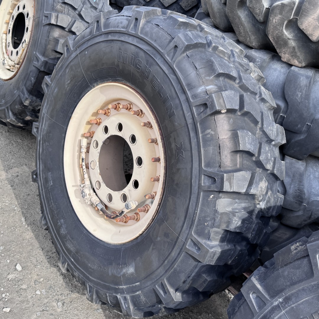 395/85R20 Michelin brand radial OTR tractor tire. It is a XML Military M3 OffRoad model with a 14-Ply load rating. This is a Used tire with a tread depth of 25/32nds. The condition report reads: Clean, On Double Bevel Rim, Mild Age Cracks in Tread, 2006.
