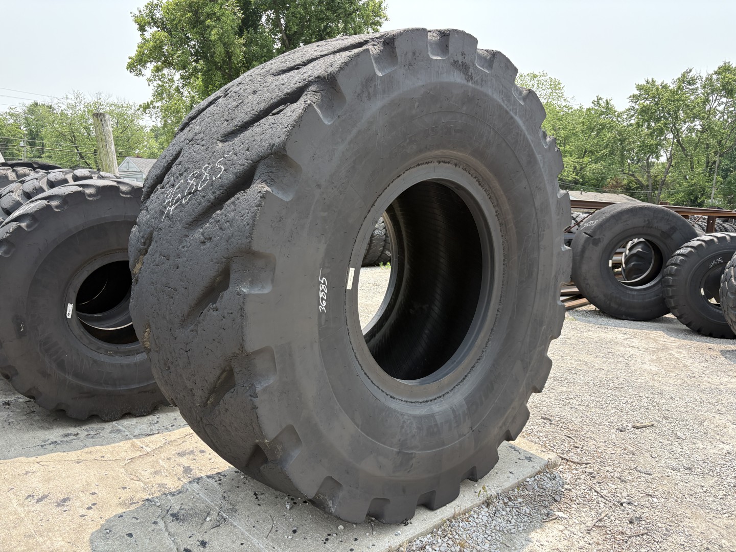 45/65R45 Michelin brand radial OTR tractor tire. It is a XMINED2 L-5 model with a 2-Star load rating. This is a Used tire with a tread depth of 58/32nds. The condition report reads: Clean, Sidewall & Liner Spots.