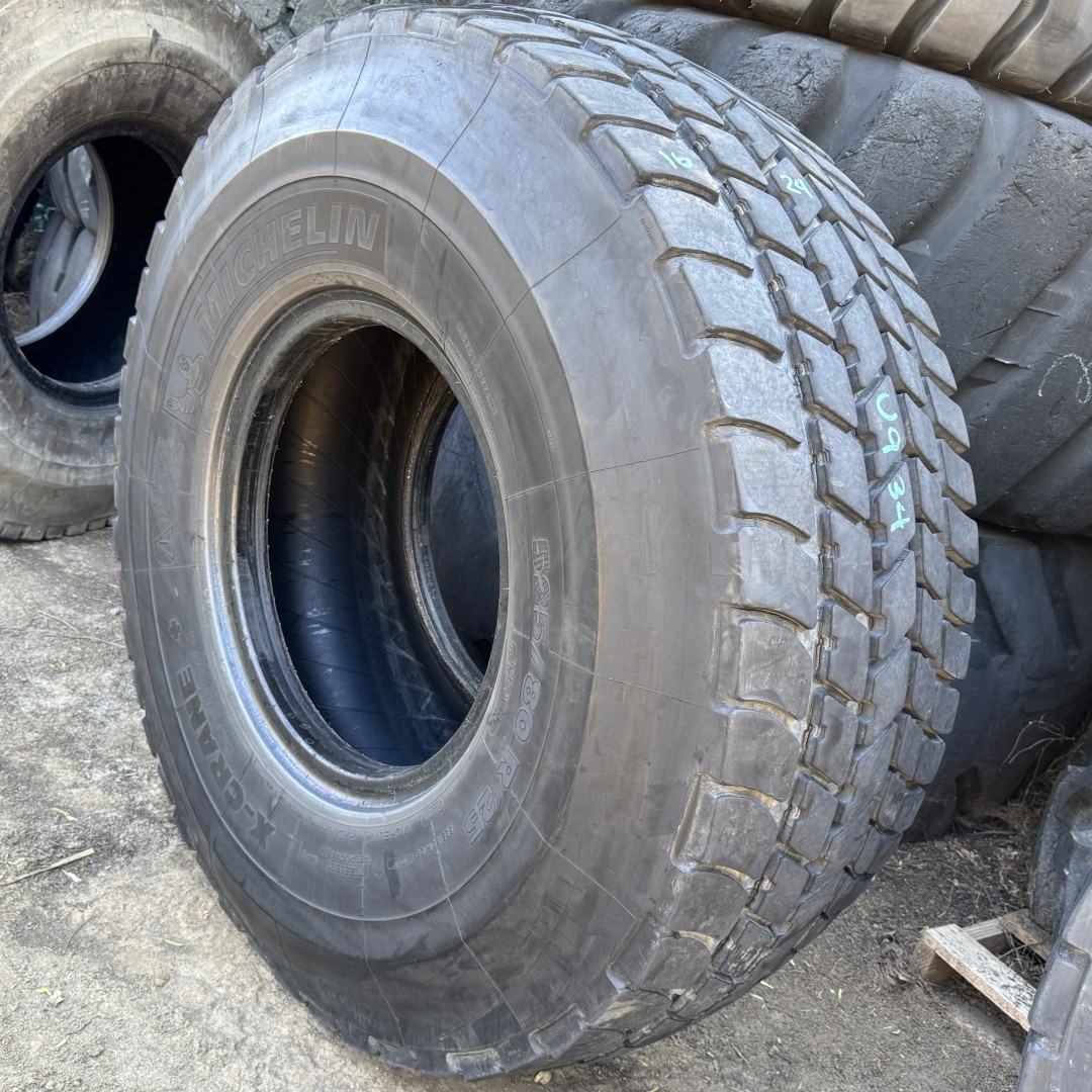 525/80R25 Michelin brand radial OTR tractor tire. It is a X-Crane E2 Crane model with a 176F load rating. This is a Used tire with a tread depth of 20/32nds. The condition report reads: Clean, Shoulder Wear on One Side (20.5R25).