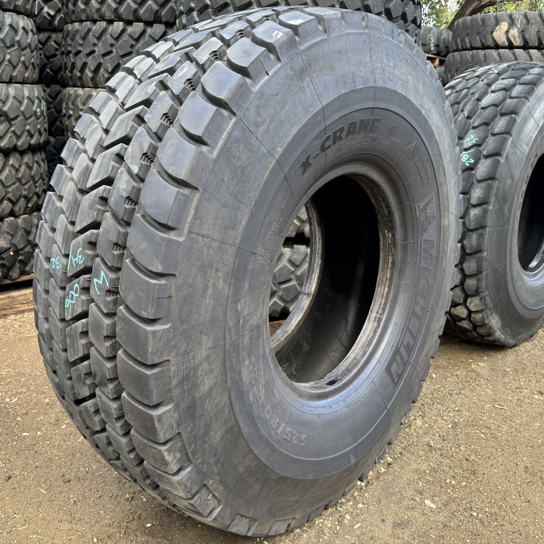 525/80R25 Michelin brand radial OTR tractor tire. It is a X-Crane E2 Crane model with a 176F load rating. This is a Used tire with a tread depth of 34/32nds. The condition report reads: Clean (20.5R25).