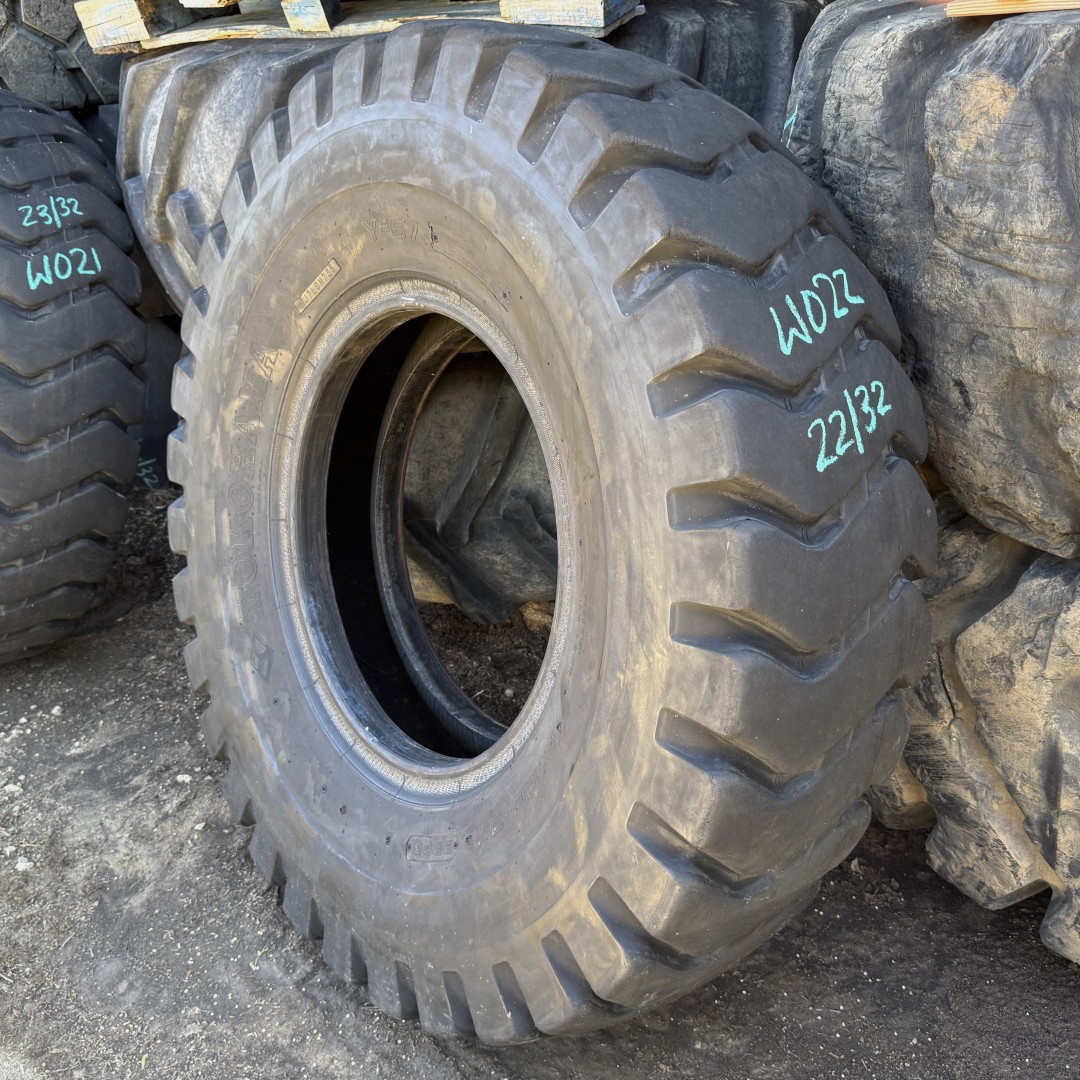 14.00X24 Yokohama brand bias OTR tractor tire. It is a Y67 E3/L3/G3/IND3 model with a 28-Ply load rating. This is a Used tire with a tread depth of 22/32nds. The condition report reads: Clean.