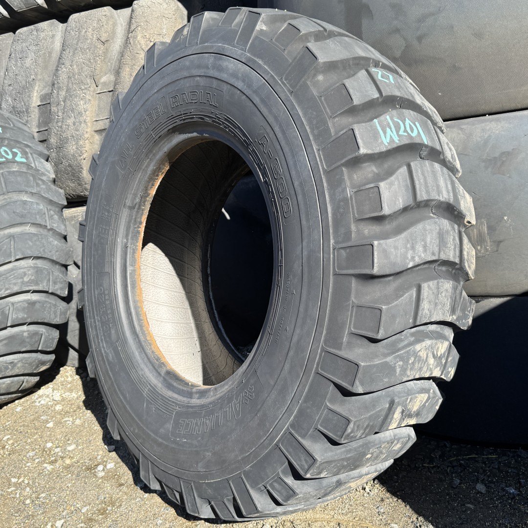 15.5X25 Alliance brand bias OTR tractor tire. It is a A-600 A600 E2/L2/G2 model with a 1-Star load rating. This is a Used tire with a tread depth of 27/32nds. The condition report reads: Clean.