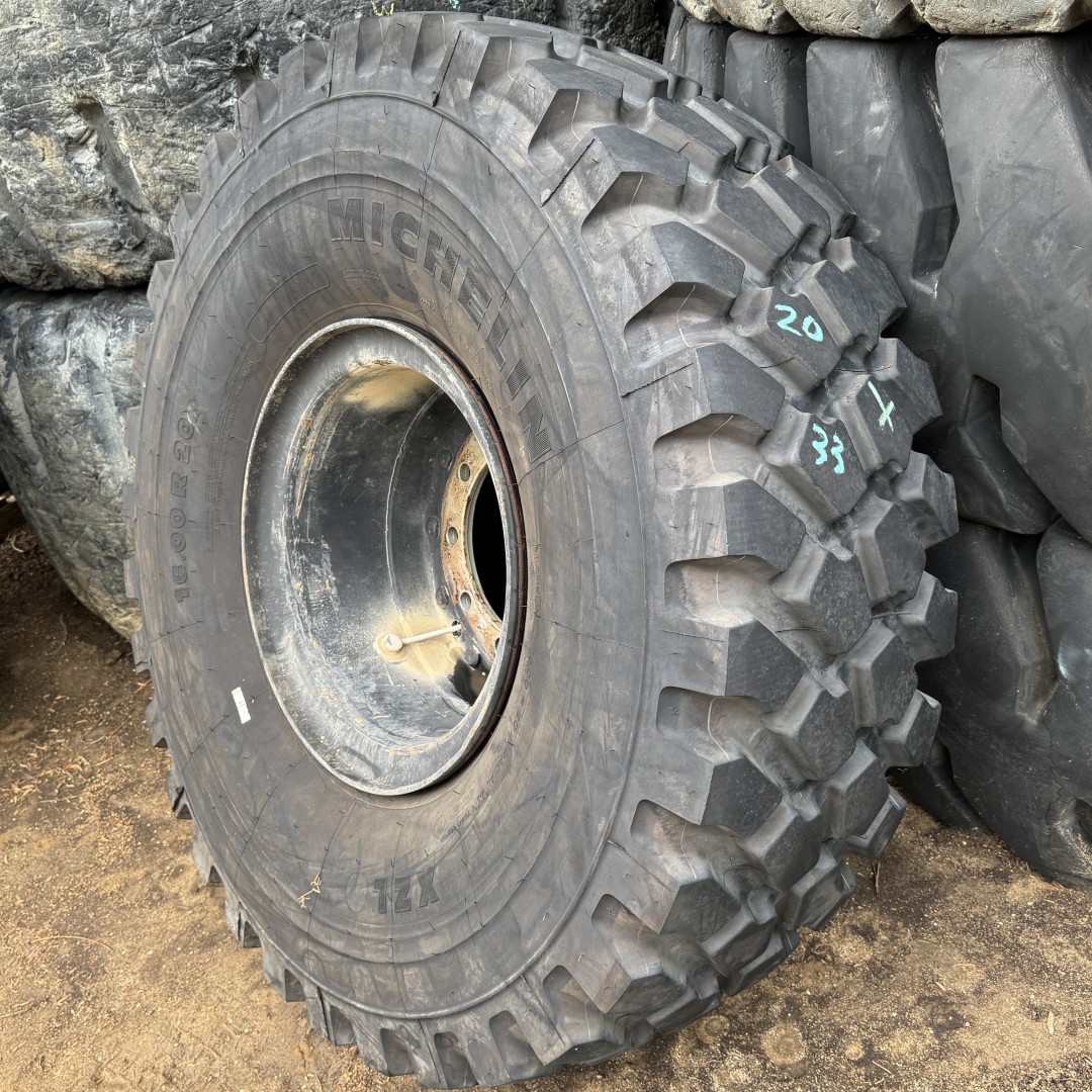16.00R20 Michelin brand radial OTR tractor tire. It is a XML Military M-3 Off-Road model with a 173/170G load rating. This is a Used-Low-Hour tire with a tread depth of 33/32nds. The condition report reads: Clean, 2020, On Rim.