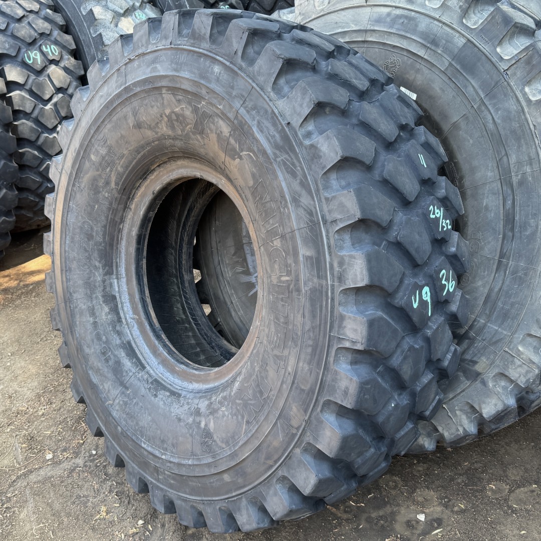 16.00R20 Michelin brand radial OTR tractor tire. It is a XML Military M-3 Off-Road model with a 173/170G load rating. This is a Used tire with a tread depth of 26/32nds. The condition report reads: Clean, 2011.