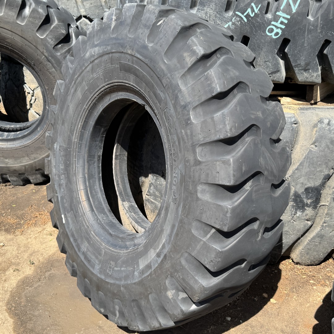 16.00X25 Advance brand bias OTR tractor tire. It is a Rock Regular E-3/L-3 model with a 32-Ply load rating. This is a Used tire with a tread depth of 22/32nds. The condition report reads: Clean.