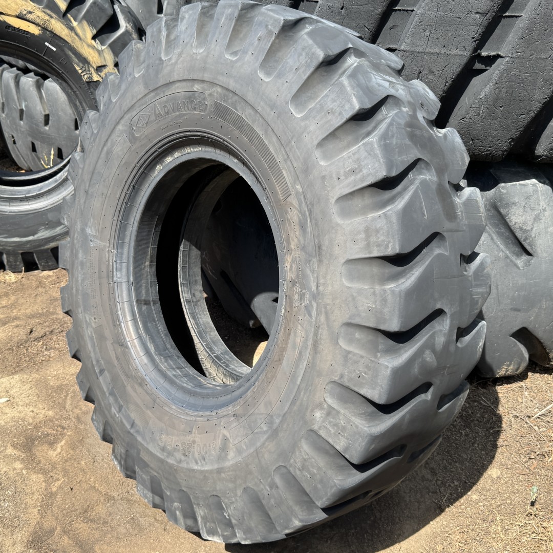 16.00X25 Advance brand bias OTR tractor tire. It is a Rock Regular E-3/L-3 model with a 32-Ply load rating. This is a Used tire with a tread depth of 22/32nds. The condition report reads: Clean.