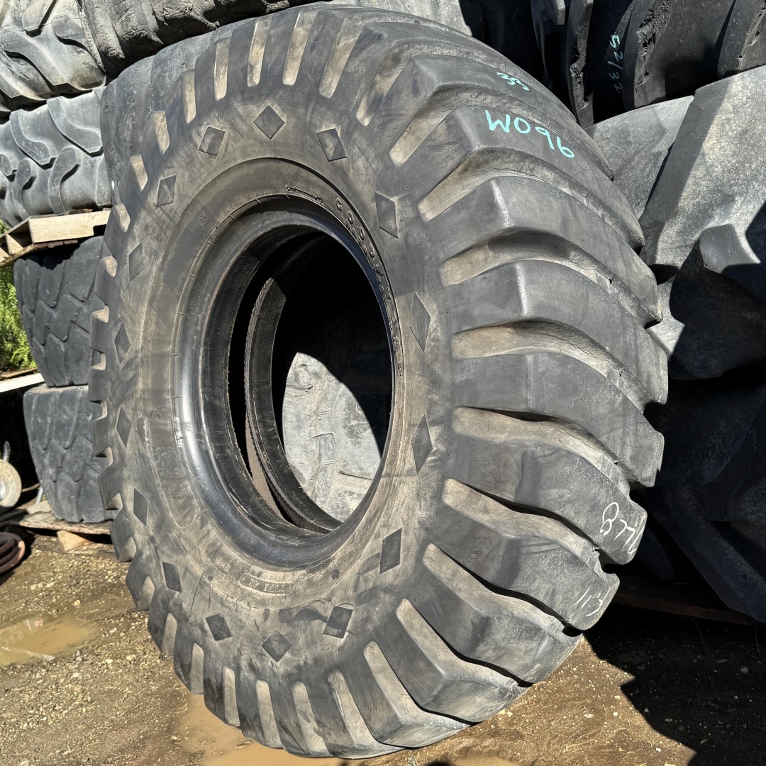 16.00X25 Goodyear brand bias OTR tractor tire. It is a HRL Hard Rock Lug E-3/L-3 model with a 24-Ply load rating. This is a Used tire with a tread depth of 33/32nds. The condition report reads: Clean, Old.