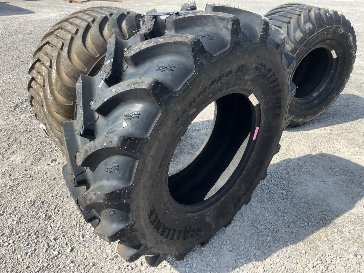 16.9R24 Alliance brand radial OTR tractor tire. It is a FarmPro II R-1 model with a 137A8 load rating. This is a New tire with a tread depth of 58/32nds. The condition report reads: Unused, 420/85R24.