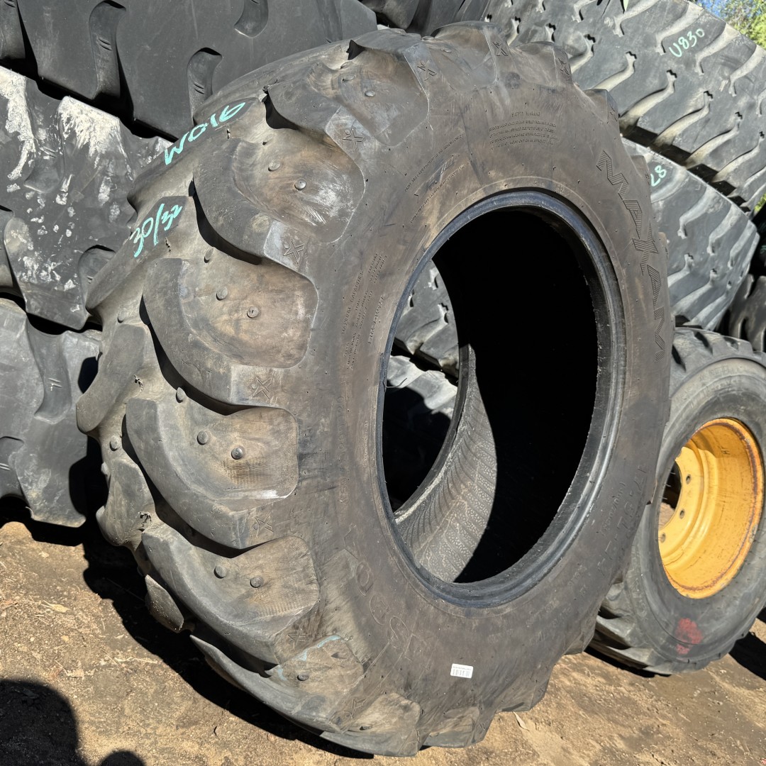 17.5L24 Maxam brand bias OTR tractor tire. It is a MS904 R-4 model with a 12-Ply load rating. This is a Used tire with a tread depth of 30/32nds. The condition report reads: Clean, 1-Nail Patch, 460/70X24.