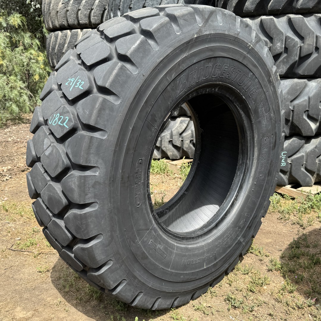 17.5R25 Bridgestone brand radial OTR tractor tire. It is a VMT E-3/L-3 model with a 1-Star load rating. This is a Used tire with a tread depth of 29/32nds. The condition report reads: Clean, Heat Cracks in Tread.