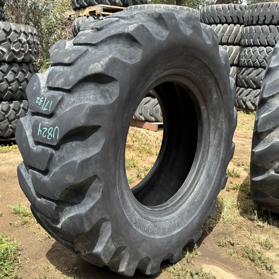 17.5X25 Firestone brand bias OTR tractor tire. It is a SGG Super Ground Grip E-2/L-2/G-2 model with a 12-Ply load rating. This is a Used tire with a tread depth of 17/32nds. The condition report reads: Clean, Aged.