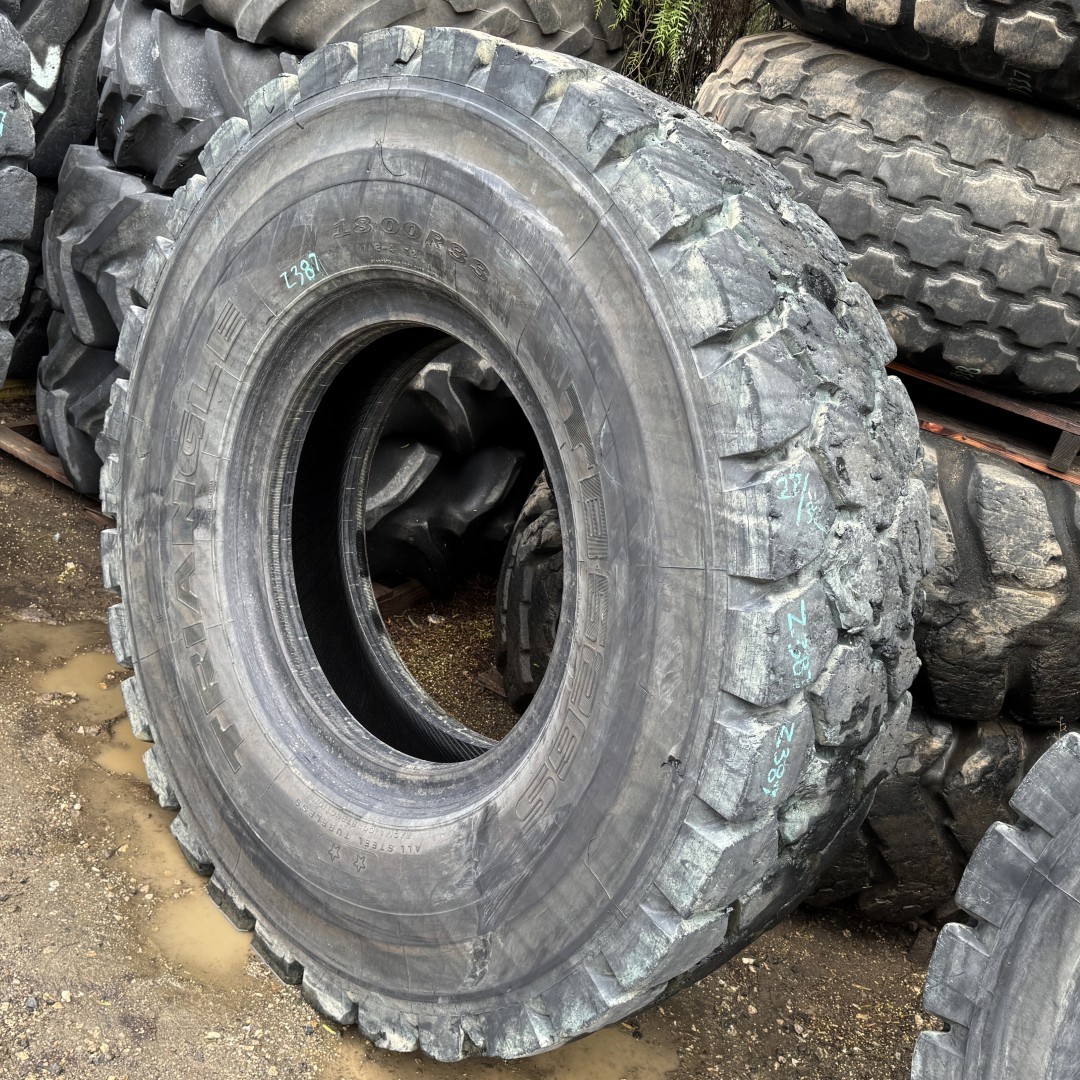 18.00R33 Triangle brand radial OTR tractor tire. It is a TB526S E4 model with a 2-Star load rating. This is a Used tire with a tread depth of 27/32nds. The condition report reads: Clean, Mildly Weathered Tread.