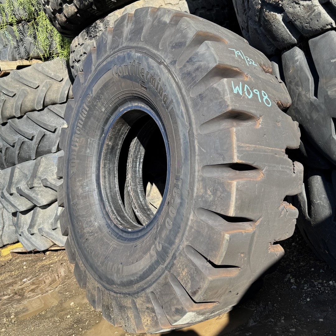 18.00X25 Continental brand bias OTR tractor tire. It is a Container Master E-4/IND-4 model with a 40-Ply load rating. This is a Used tire with a tread depth of 79/32nds. The condition report reads: Clean, Minor Rock Cuts on One Shoulder.