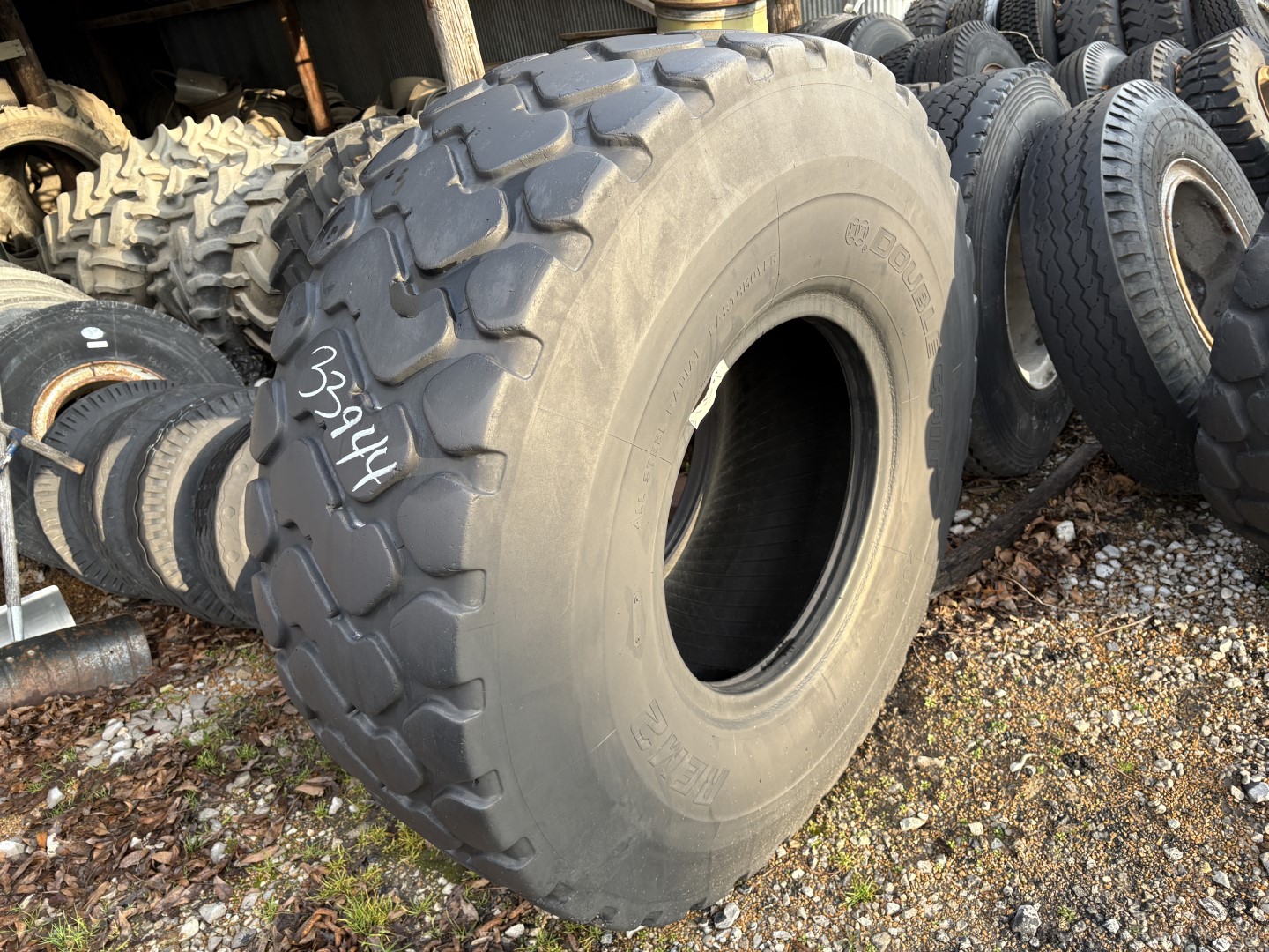 20.5R25 Double Coin brand radial OTR tractor tire. It is a REM2 E-3/L-3 model with a 2-Star load rating. This is a Used tire with a tread depth of 20/32nds. The condition report reads: Clean, Shoulder Spots.