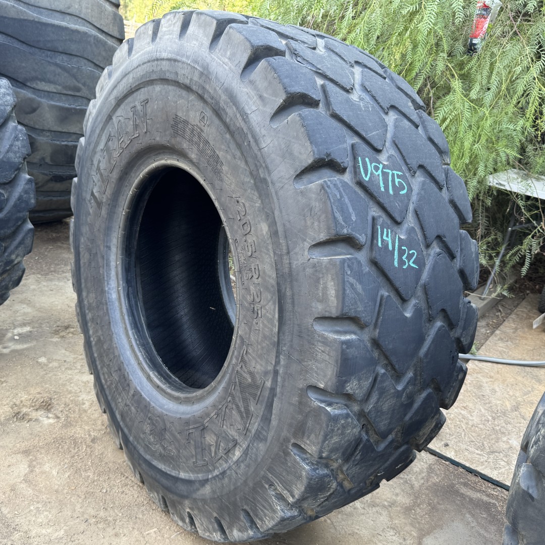 20.5R25 Titan brand radial OTR tractor tire. It is a MXL E-3/L-3 model with a 1-Star load rating. This is a Used tire with a tread depth of 14/32nds. The condition report reads: Clean, Low Tread, Minor Cuts on One Sidewall.