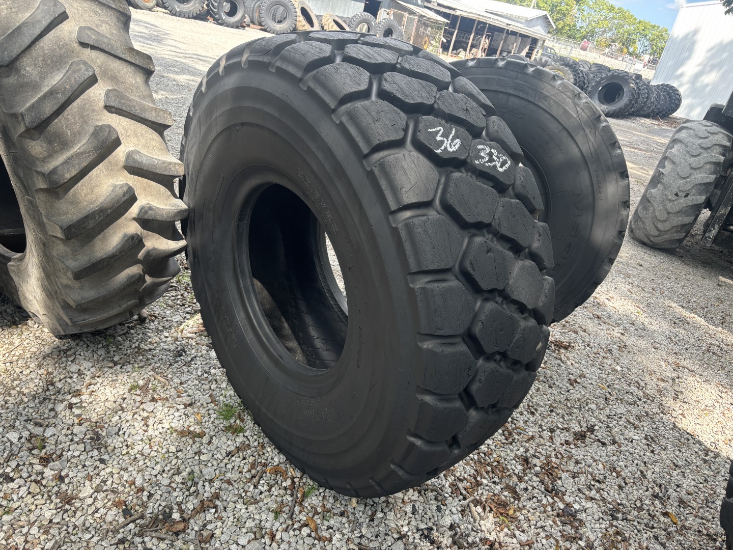 20.5R25 Yokohama brand radial OTR tractor tire. It is a RB31 E-3/L-3 model with a 2-Star load rating. This is a Used tire with a tread depth of 38/32nds. The condition report reads: Clean, Sidewall Spots.