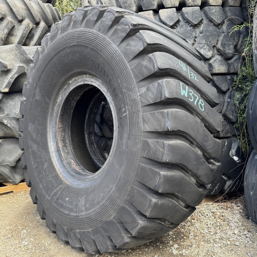 21.00X25 Galaxy brand bias OTR tractor tire. It is a Super Trac L3/E3/IND3 model with a 40-Ply load rating. This is a Used tire with a tread depth of 41/32nds. The condition report reads: Clean.