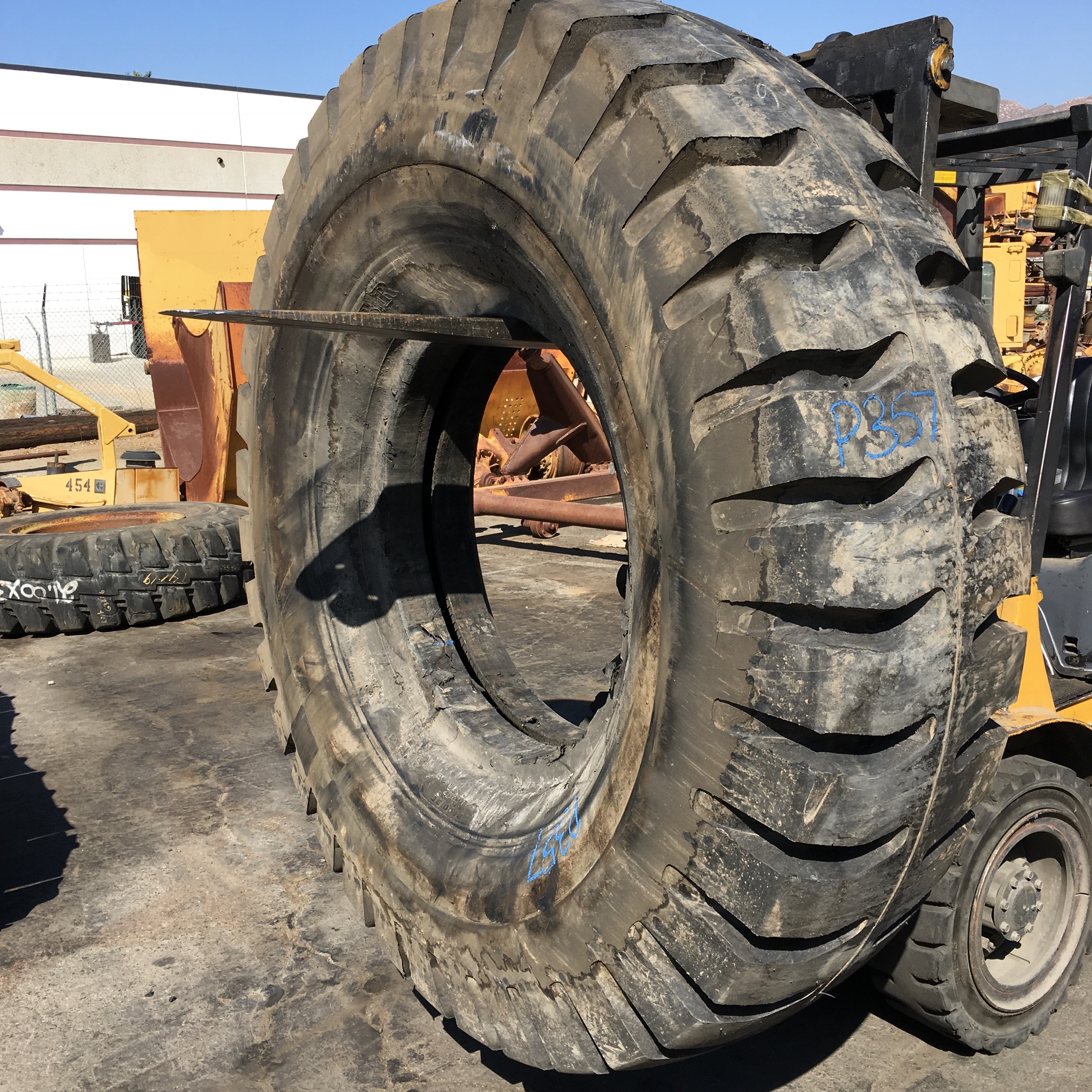 21.00X35 Bridgestone brand bias OTR tractor tire. It is a VRLS E4 model with a 36-Ply load rating. This is a Retread-Used tire with a tread depth of 60/32nds. The condition report reads: Clean, Severe Bead Damage.
