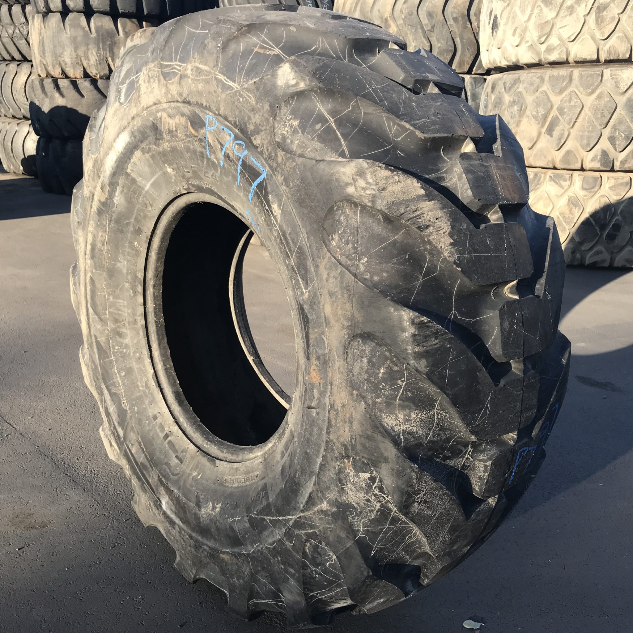 21LX24 Firestone brand bias OTR tractor tire. It is a SGG Super Ground Grip E2/L2/G2 model with a 10-Ply load rating. This is a Retread-New tire with a tread depth of 34/32nds. The condition report reads: 2 Patches.