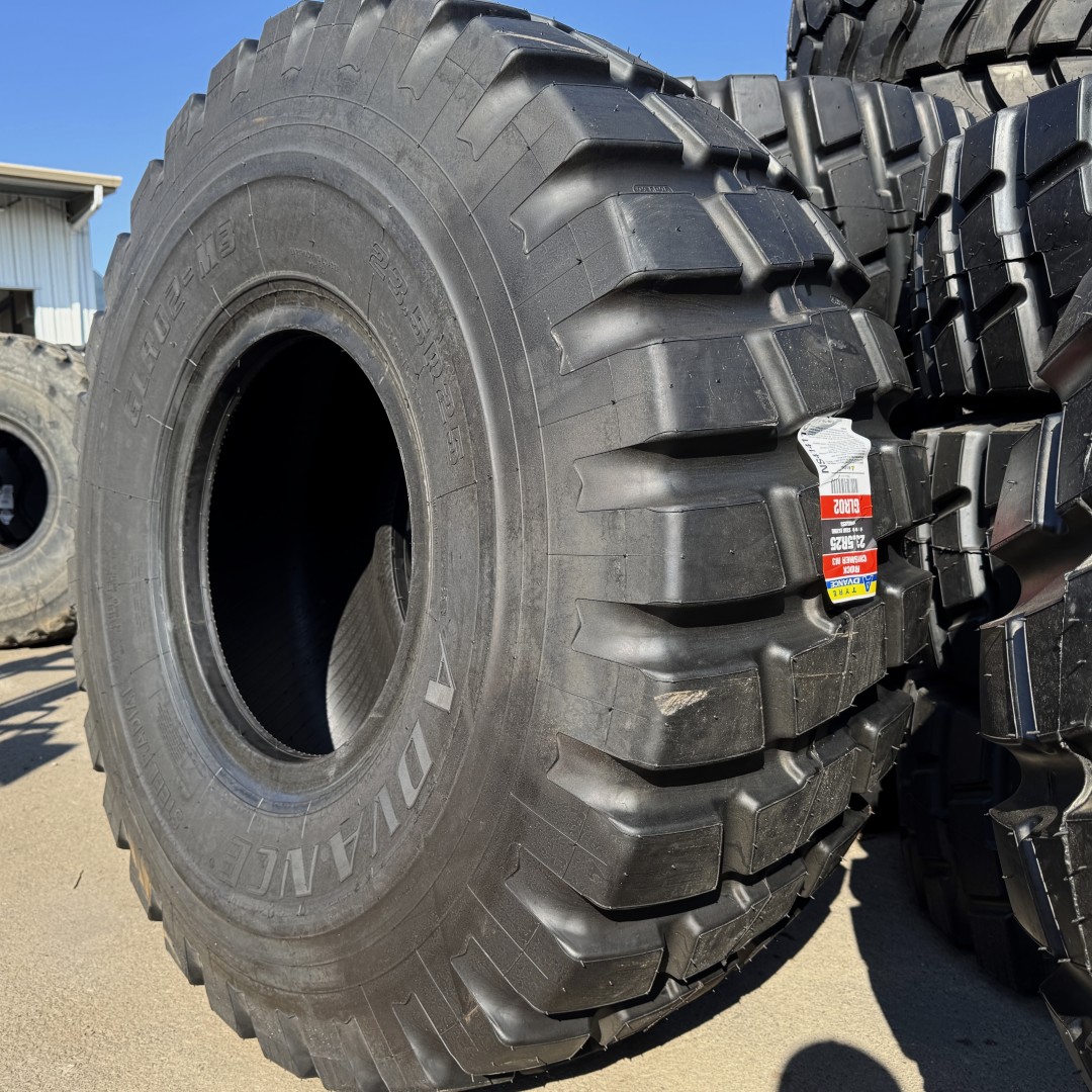 23.5R25 Advance brand radial OTR tractor tire. It is a GLR02 E-3/L-3 model with a 2-Star load rating. This is a New tire with a tread depth of 41/32nds. The condition report reads: Unused.