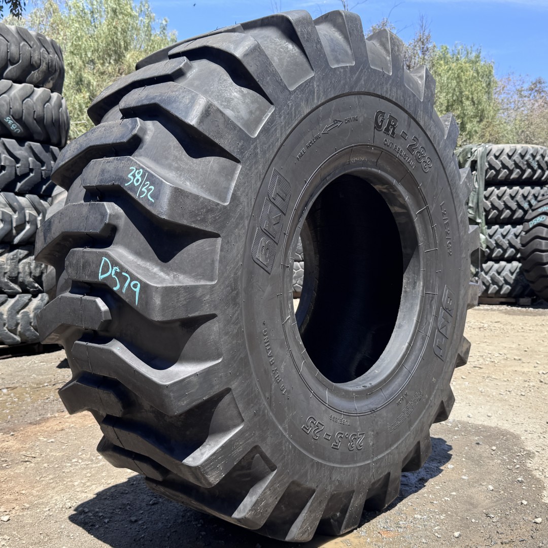 23.5X25 BKT brand bias OTR tractor tire. It is a GR-288 L2/G2 model with a 16-Ply load rating. This is a New tire with a tread depth of 38/32nds. The condition report reads: Unused.