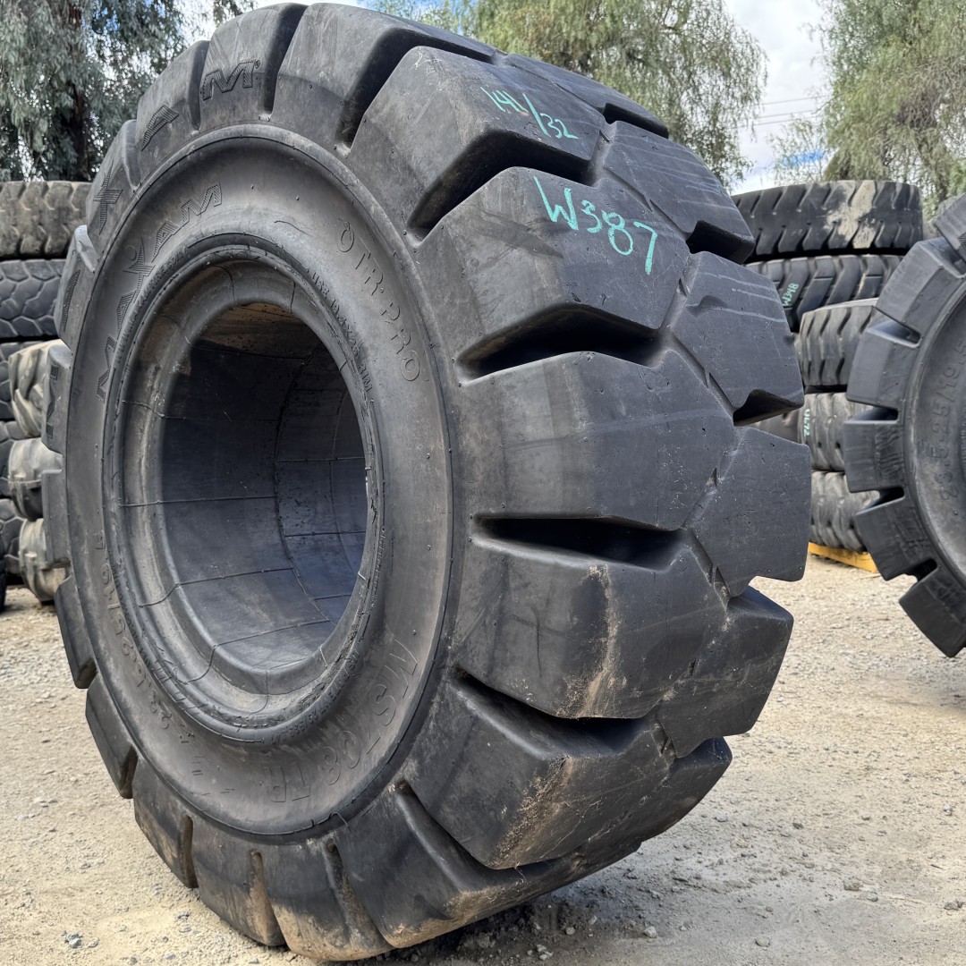 23.5X25 Maxam brand bias OTR tractor tire. It is a MS708 TR OTR Pro L5 model with a Solid load rating. This is a Used tire with a tread depth of 141/32nds. The condition report reads: Clean, V53320, Fits 19.5X25 Rim.