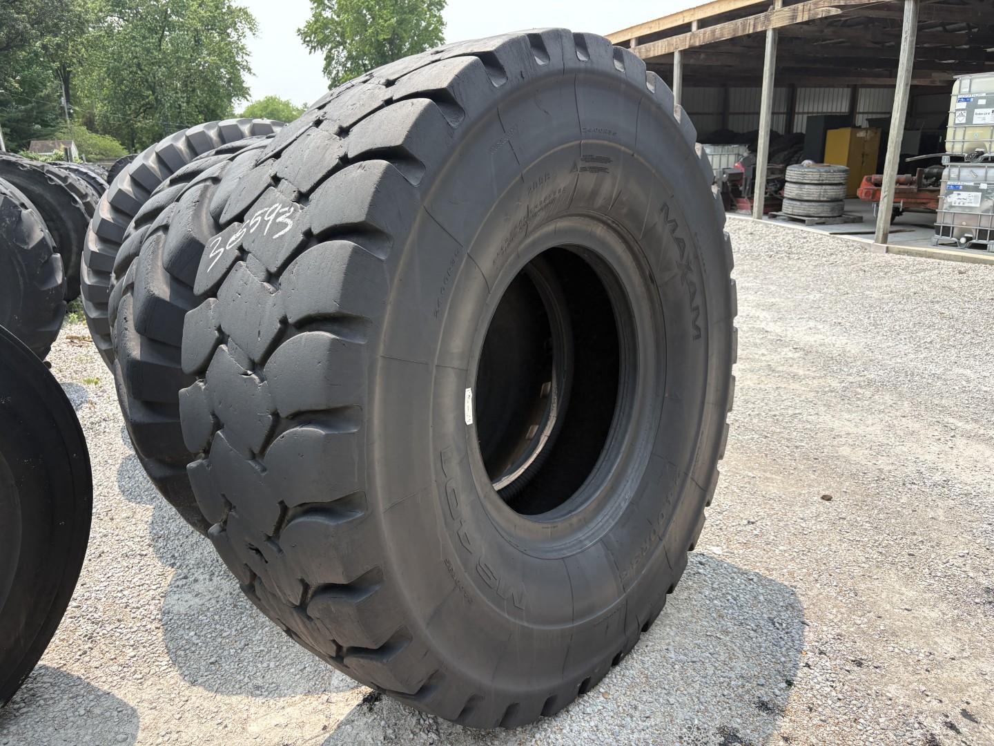 24.00R35 Maxam brand radial OTR tractor tire. It is a MS401 E-4 model with a 2-Star load rating. This is a Used tire with a tread depth of 32/32nds. The condition report reads: 1-Sidewall Section, Liner Spots.